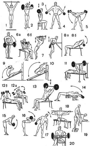 В стандартную тренировочную схему укладывается 12 упражнений: 4 — для рук, 3 — для груди, 3 — для спины и 2 — для пресса. (Если мышцы голени и предплечья развиты нормально, то специальные упражнения для этих групп в каждую тренировку можно не включать, но если они нарушают пропорциональность развития, то не следует ими пренебрегать.)