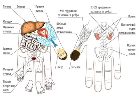 Все внутренние органы живота — на ладони, мочеполовая система отображена у основания пальцев. Причем считается, что женщине следует начинать массаж с правой кисти, а мужчине — с левой.