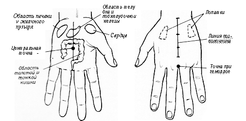 Геморрой часто причиняет мучительную боль. Точка, которую нужно стимулировать при этой болезни, расположена на тыльной поверхности ладони, она соответствует спине, на межфаланговом промежутке между 3 и 4 пальцами (см. рисунок 2).