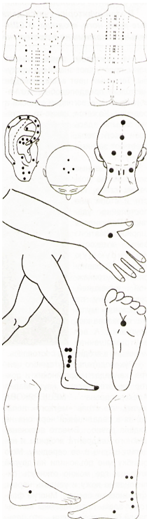 На рисунке представлены биоактивные точки (БАТ), на которые следует ставить медные пластины. Выбор формы и размеров пластин осуществляется с помощью маятника или Г-образной металлической рамки. Продолжительность непрерывного ношения пластин на теле 2-5 суток в зависимости от чувствительности кожи к пластинам. Медные пластины перед постановкой на тело должны быть отожжены на газовой горелке. Продолжительность лечения зависит от степени снижения энергетики организма больного и шишковидной железы.