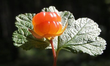В наших северных лесах первым делом зацветает янтарная ягода-морошка. Ей недаром дали такое солнечное название. Морошка, когда созреет, действительно похожа на янтарь. Пока она незрелая — красная, как обычная ягода, а как поспеет — так и пожелтеет. За это ее еще называют «ягодой наоборот».