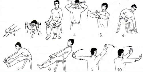 8. Сидя на стуле, голову держать прямо. Вытянуть обе руки вперед ладонями к себе так, чтобы средний палец находился на уровне кончика носа. Не отрывая взгляда от среднего пальца правой руки, медленно приблизить руку к лицу до соприкосновения среднего пальца с кончиком носа. Затем медленно вернуть руку в и. п. и то же — левой, по 5 раз.