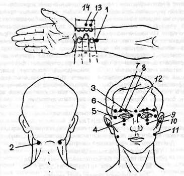 Массаж точек производят кончиками указательных пальцев: нажимают вибрирующим движением одновременно на две точки, расположенные симметрично.