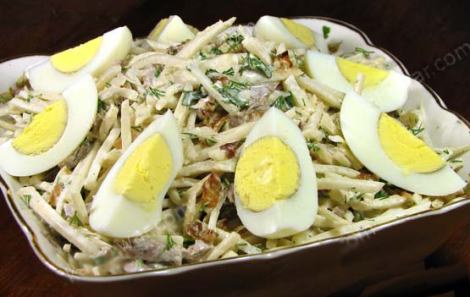 — Затем возьмем большую миску, в которой смешаем мясо, редьку, лук, майонез, черный перец и соль.