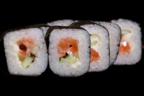 — На рис следует положить полоску семги и огурца, а также сливочный сыр, который нужно предварительно положить в кулинарный мешок и выдавливать.