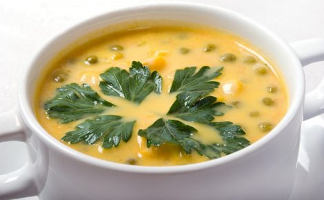 — Положите нарезанные овощи, а также горох, петрушку и чеснок в кастрюлю, залейте все бульоном и варите суп в течение 1 часа 20 минут, за это время все овощи и горох станут очень мягкими.