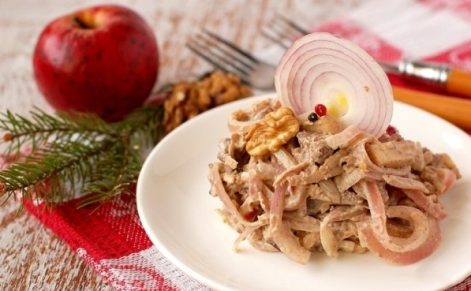 В глубокую тарелку выложите печень, с яблоками и луком, добавьте орехово-яблочную заправку, посолите, все ингредиенты хорошо перемешайте и поставьте на 10 минут в холодильник, где она промаринуется.