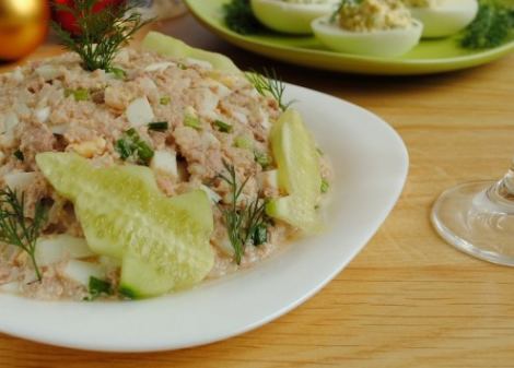 Если уже готовый салат из печени трески перед подачей к столу дополнить в качестве оформления листьями зелёного салата или ломтиками свежего огурца, то даже гурманы вряд ли выкажут вам свои, зачастую даже уместные замечания, и всецело останутся довольны.