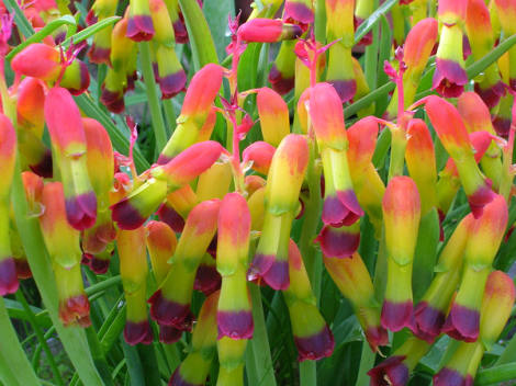 — Лахеналия луковичная, или повислая. У этого растения сочные прямостоячие листья длиной 30 см и шириной 5 см. На листьях у этого вида обычно нет пятнистого рисунка. На пурпурно-коричневом побеге высотой 40 см расположено верхушечное соцветие примерно из 20 оранжево-красных цветков длиной 3-4 см. Сначала они растут под острым углом к стеблю, а позже поникают.
