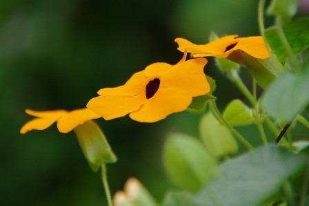 • Чаще всего в наших домах можно увидеть тунбергию крылатую. У нее забавные цветы, похожие на веселые любопытные глазки. Трубчатые крупные (до 5 см) белые и всех оттенков желтого, от изысканного бледно-желтого до необычного густо-желтого, цветки имеют очень темные, почти черные пятна в центре. Тунбергию крылатую обычно выращивают как однолетник, но при хорошем уходе она будет расти и цвести в вашем доме несколько лет.