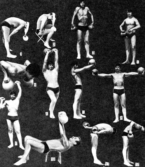 Одно из эффективных упражнений — одновременный и попеременный жим гантелей и гирь в положении стоя (фото 9) и сидя двумя и одной рукой.