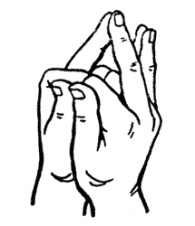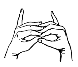 Согните средние пальцы рук и прижмите к внутренним поверхностям ладоней. Остальные пальцы левой и правой рук соединяются в выпрямленном положении. При этом безымянные и указательные пальцы соединены между собой над согнутыми средними пальцами (фото 4).