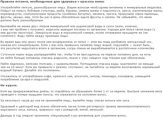 Не секрет, что в здоровом организме и здоровые волосы. Современные исследования косметологических фирм доказали, что помимо внешних оздоровительных процедур волосы еще нуждаются и во внутренней подпитке. Одним словом — для них важно, что вы кушаете каждый день. Правильное питание — это залог красоты и здоровья волос. Рацион правильно сбалансированный белковым питанием, углеводами и жирами, насыщенный микроэлементами и витамина весьма положительно скажется на состоянии волос, сделает их насыщенными и блестящими. Придерживайтесь определенных правил в питании и вы не будете испытывать проблем.