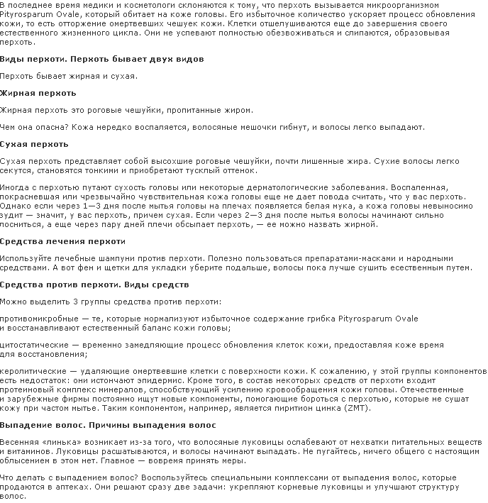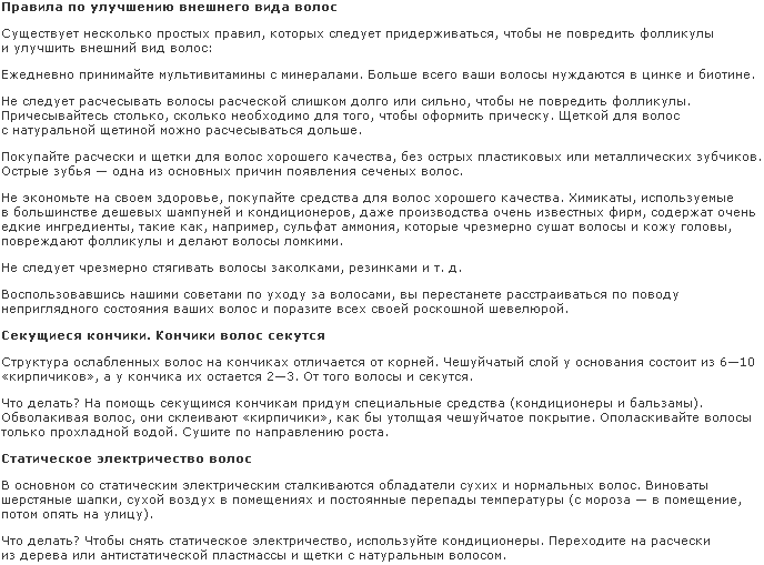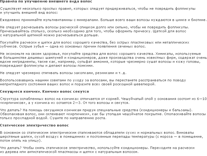 Волосы способны подчеркнуть или скрыть недостатки фигуры и лица каждой женщины. В некоторых случаях они и сами являются олицетворением красоты. Не удивительно, что с древних времен барышни придавали большое значение уходу за волосяным покровом и использовали для этого различные способы и средства, которые давала им природа. Однако одного ухода недостаточно. Например замечено, что общее состояние организма влияет на внешний вид волос. Если весной мы испытываем авитаминоз, то и наши волосы не имеют присущего блеска и выглядят не совсем здоровыми. Излишнее воздействие солнечных лучей так же может отрицательно сказаться на состоянии волос и привести к их ослаблению. Если вы хотите выглядеть привлекательно всегда, то уход за волосами должен быть вашей ежедневной заботой.